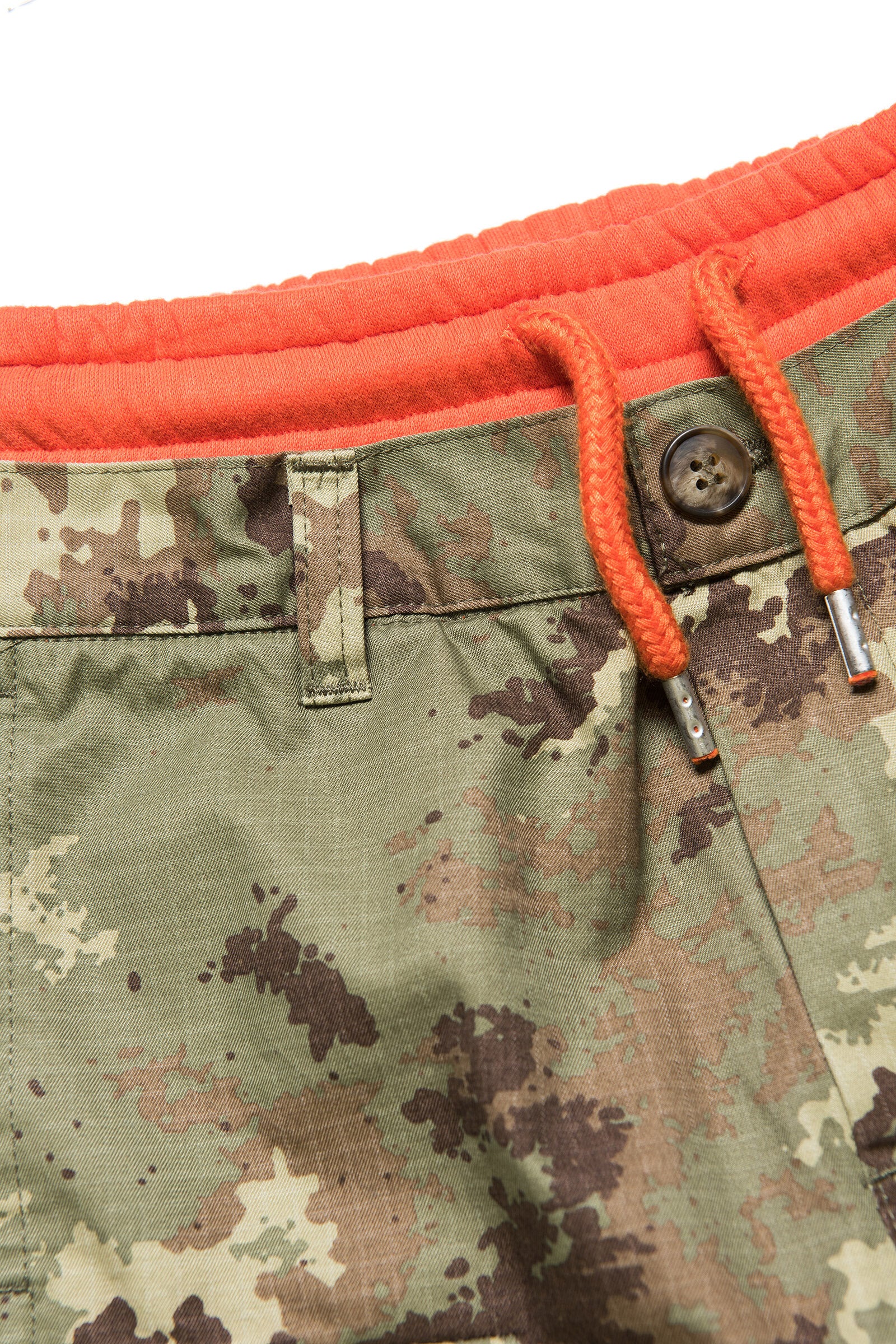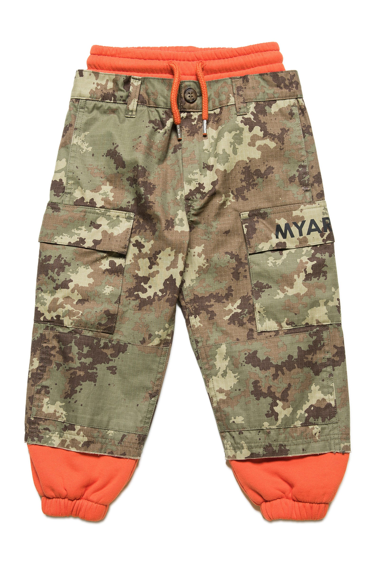 Double-layer cargo pants: camouflage fabric exterior and orange fleece interior.